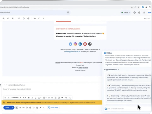 點擊HIX AI圖示即可取得 3 個建議回覆建議,每個建議均根據寄件者的意圖量身定制,只需點擊一下,即可立即獲得完整的電子郵件回覆。